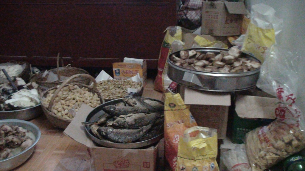 厨房里摆满了食物,每一样都很多,其实这些早已准备好了,这些都是做菜用的,大人们准备饭菜,而小孩子们则坐享其成,一起吃团圆饭。