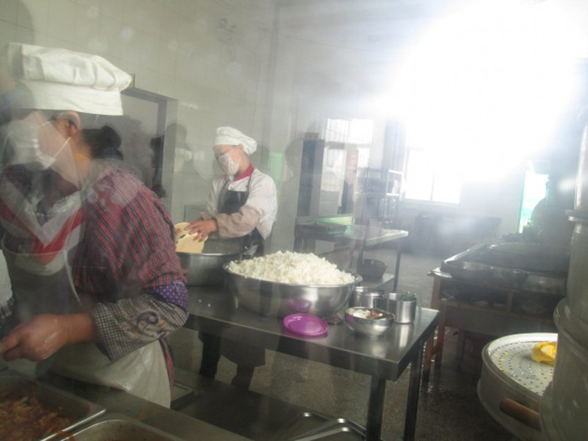 食堂里,每个班都有自己的位置,同学们男女分开坐在餐桌前热闹地用餐,不时会有大声而又愉快的笑声传来,餐厅里好一派热闹的景象!