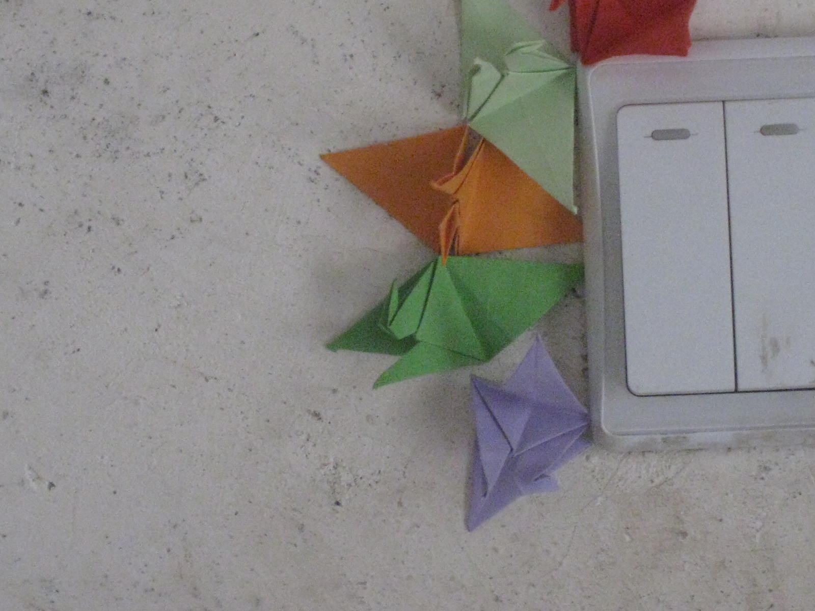 我和小伙伴们今天就聚到一起折纸,我们折纸鹤、折心、折船、折花篮子呀、、、、、、数不胜数,我最喜欢的就是我折的心和纸鹤了,瞧,我还把他们贴在了墙壁上。红的、绿的、橙的、、、、、、、无颜六色的折纸贴在自己的墙壁上,墙壁把这些折纸衬托的恰到好处呀!