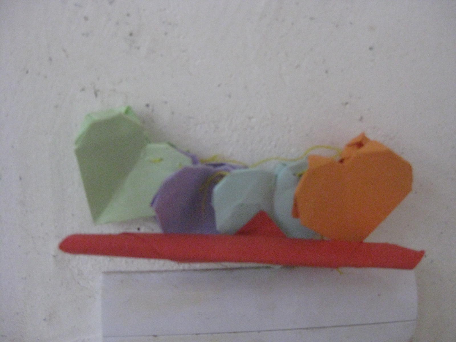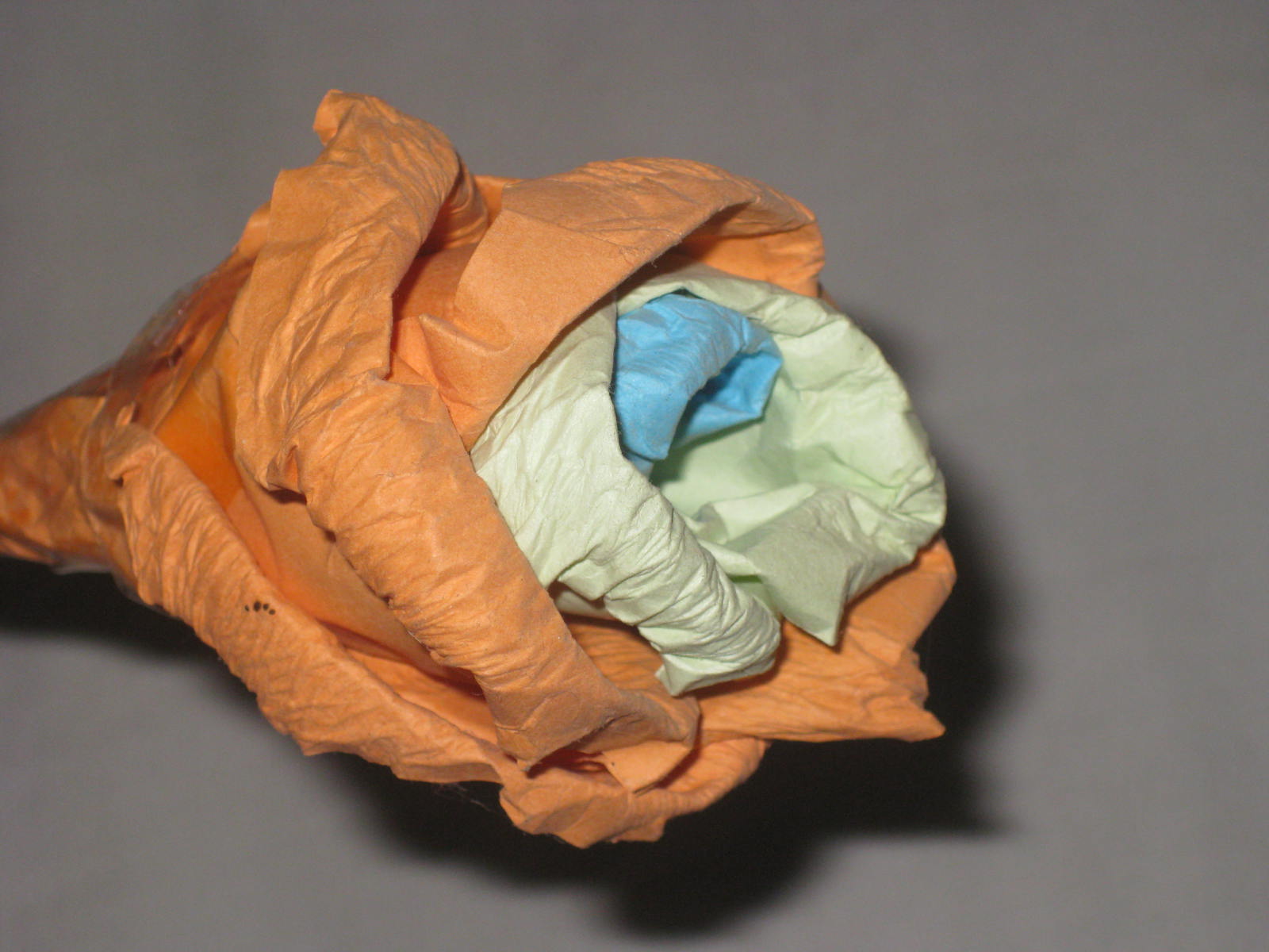 我们还折了一朵五颜六色的玫瑰花,它是由橙色,绿色和蓝色彩纸折成的。