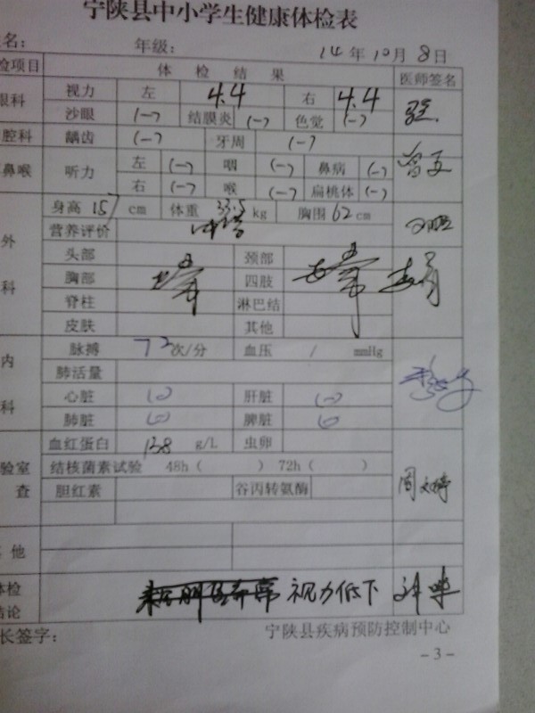 终于熬过这“可怕”的体检了。这次体检我的视力和体重没达标,所以我要好好的锻炼多吃饭,还要尽量少看电视保护视力。争取下一次每样都合格。