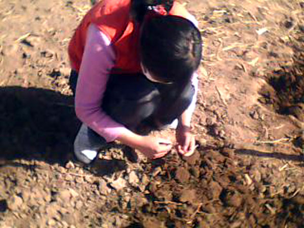 地离我家不远,我俩边走边聊,不一会就到了。我首先在地上挖了一个坑“哇!”我大叫到“这么多,真是琳琅满目啊!”我和姐姐兴奋的跳了起来,挖一会,捡一会,很快就捡了一堆。不过我们的时间有限,我们不情愿的回家了。