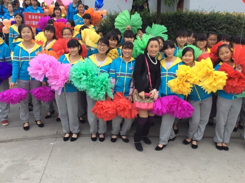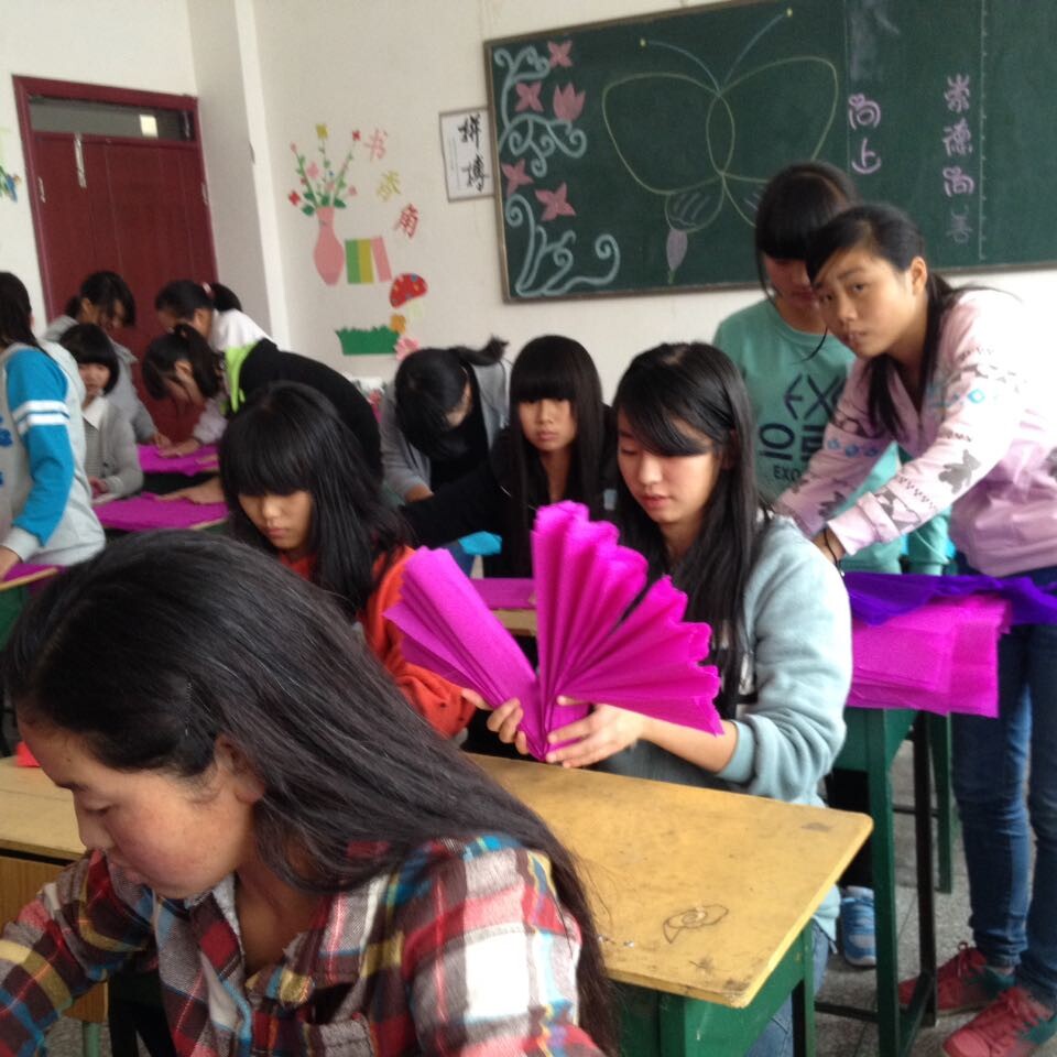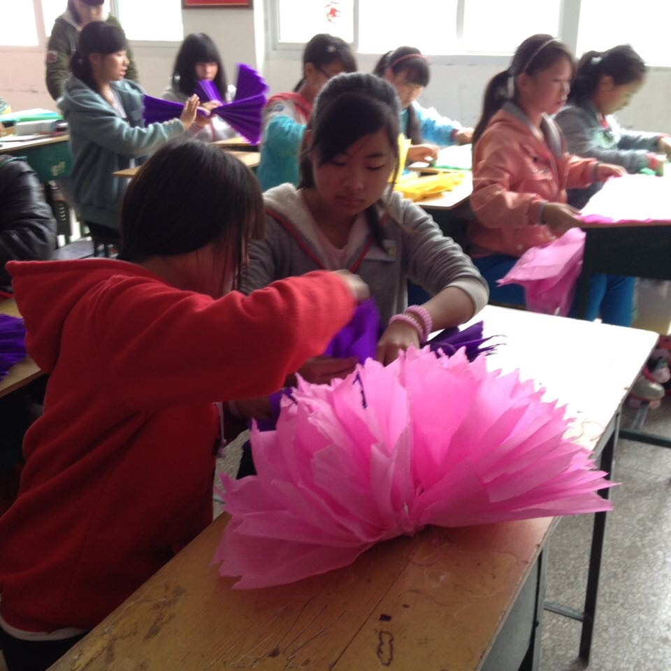 上课铃声刚响,老师抱来一大堆皱纹纸,发给我们每人4条,老师说,学校马上开运动会了,我们每人在用这纸折两朵大花,在开幕式上挥舞着,同学们高兴极了。我们首先把一张纸剪成4等份然后把着4小张重叠在一起,折成均匀褶皱,把中间用绳子栓紧,第一步就好了。再把两端分别剪一个小尖尖缺口,然后在褶皱一层一层拉开就可以了。