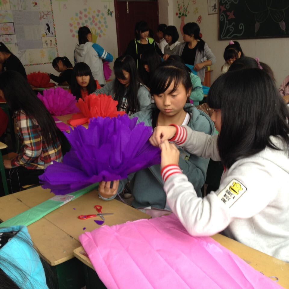 其实这个手工一下人完成还是有点困难的,老师让我们可以两两结合,互相帮忙,这个时候才觉得合作原来重要,一个人拿纸,一个人拿线,多默契啊。有时老师看到哪个同学忙不过来 ,也会帮上一把。真是一幅和谐繁忙的景象。