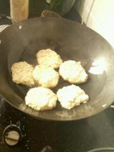 面和好了,奶奶又教我捏饼。面饼做好了之后,奶奶点燃炉子,放上锅,把油倒在锅里烧熟,她又给我示范怎样把捏好的饼放进锅里煎。