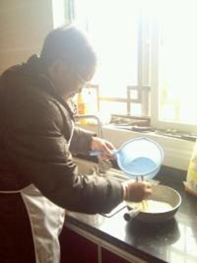看有些饼煎得差不多了,奶奶又告诉我怎么把饼反过来煎。
