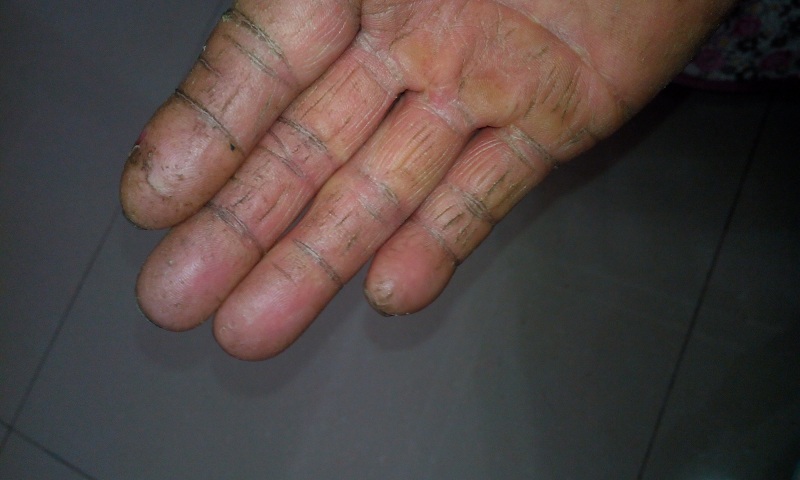 我家有一双手,粗大有力,长满老茧,但它却无比勤劳,给予了我无限关怀和帮助。这双手伤痕累累,褶皱布满整个角落,手背有些凹凸不平,手指尖儿呈土黄色,纹路又深又多,有些地方还磨破了皮,紫红紫红的,看了就让人心酸。