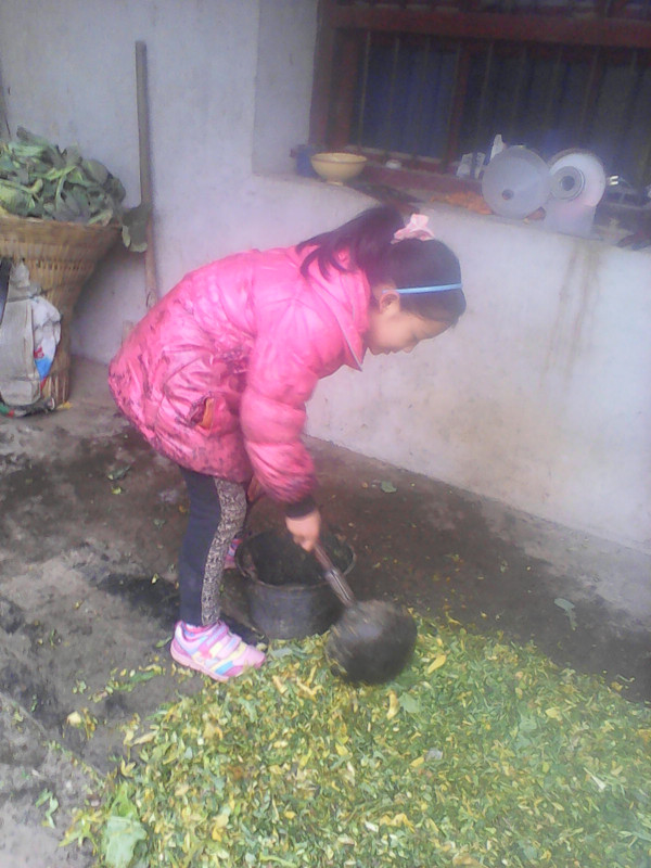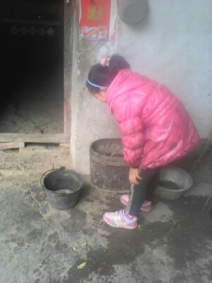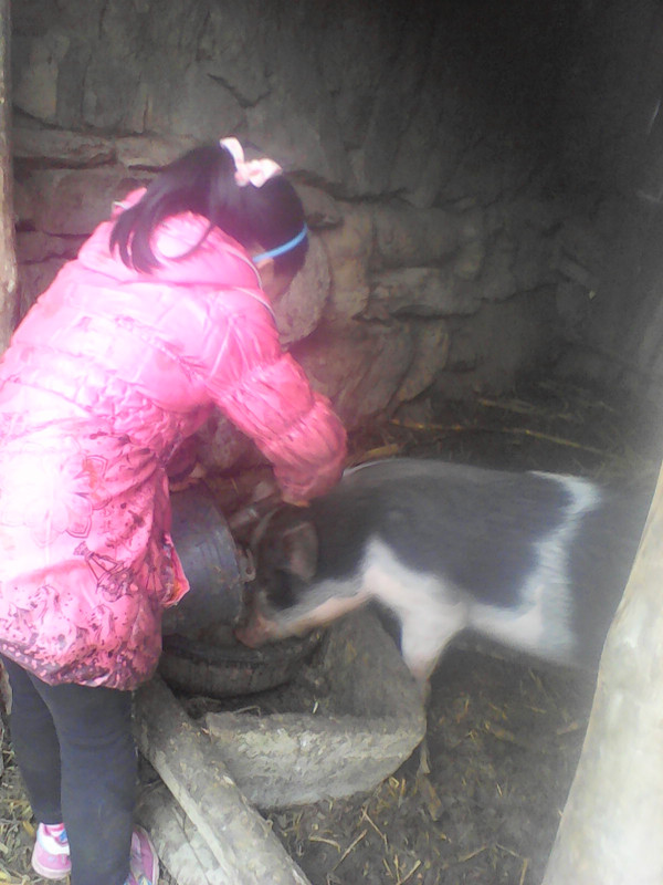 我想我应该去给它找点吃的,可是我平时却没有喂过猪,这可怎么是好呢?妈妈也不在呀,到处找猪食,终于找到了,连忙端过来给猪倒在猪圈里。