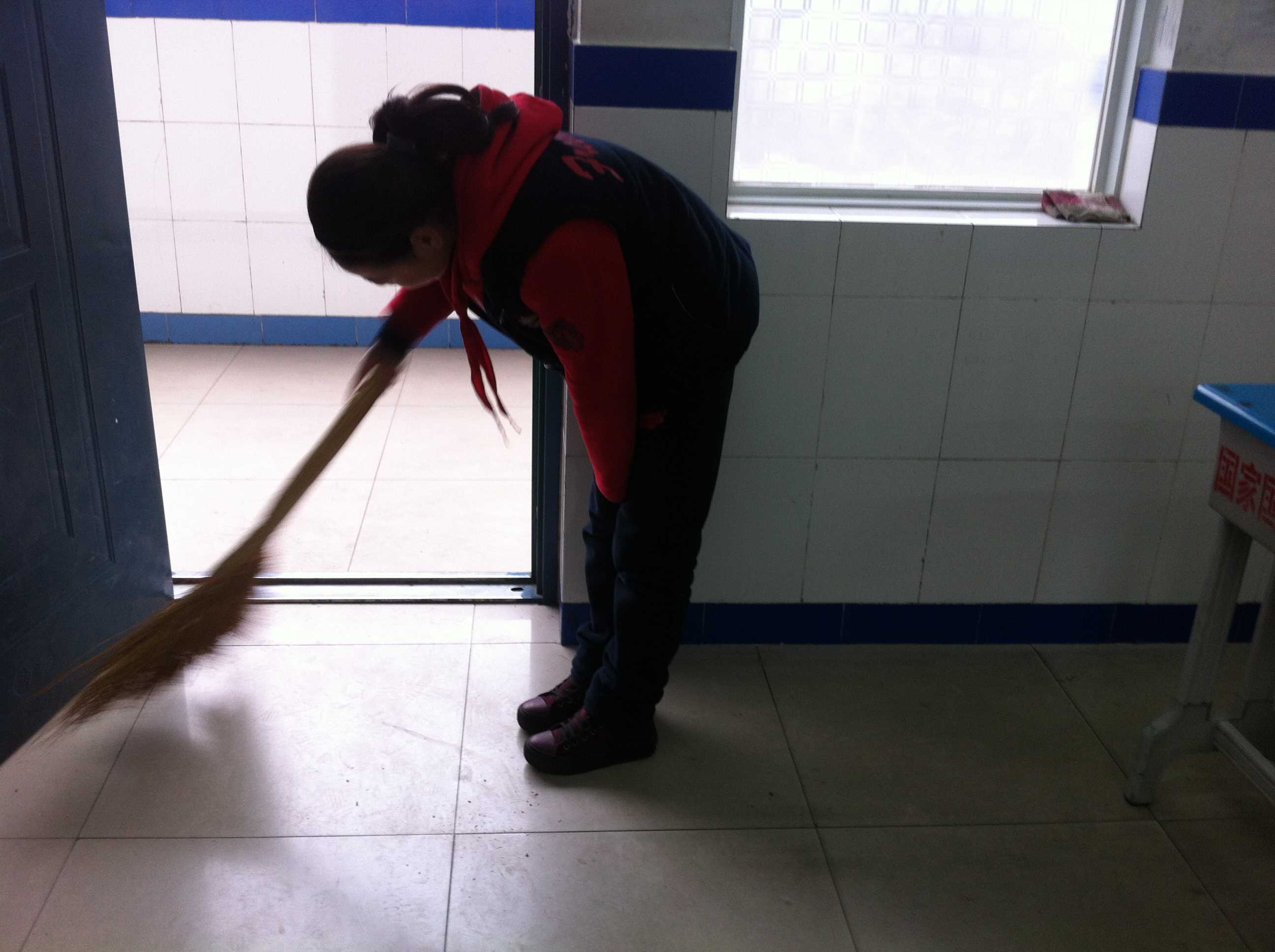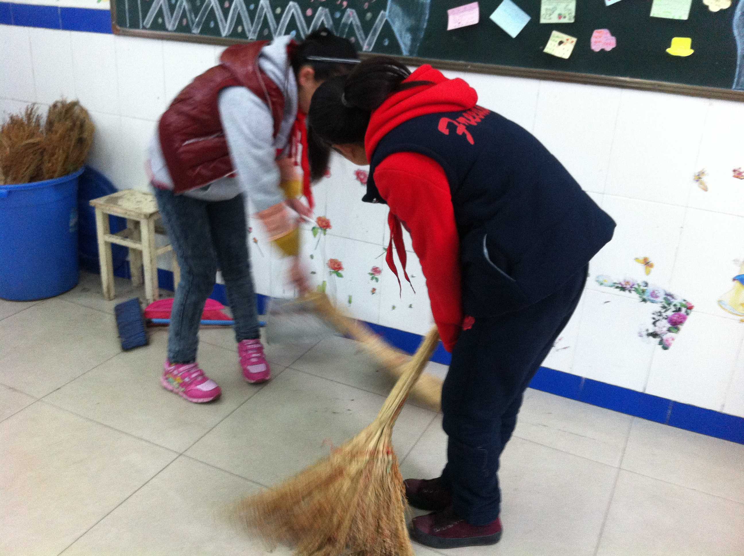 早晨,我和王钰娜早早地来到了教室,开始了今天的劳动。我们像是拿吉他似的扫把,在地上飞舞着,每一个细小的纸片都不放过,扫得一尘不染。