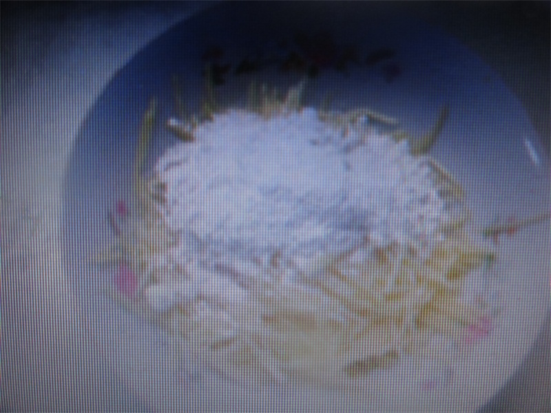 首先,奶奶在一个盆里加入大半盆面粉,然后倒入适当的水,让面粉稀一点,再把土豆丝倒入,搅均,使土豆丝和面粉融合在一起,加入适当的盐,葱花,还可以根据口味加一些胡椒,充分搅匀后,就可以烧油下锅了。
