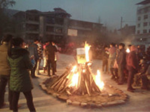 六点四十分,学校领导一声令下:“点火!”,“呼呼……”一堆堆柴火熊熊燃烧,一瞬间火光映红了校园,也映红了师生们幸福的笑脸。在熊熊火光中,主持人闪亮登场,她们用清脆的声音向师生和来宾们问好,并致以节日的美好祝愿。