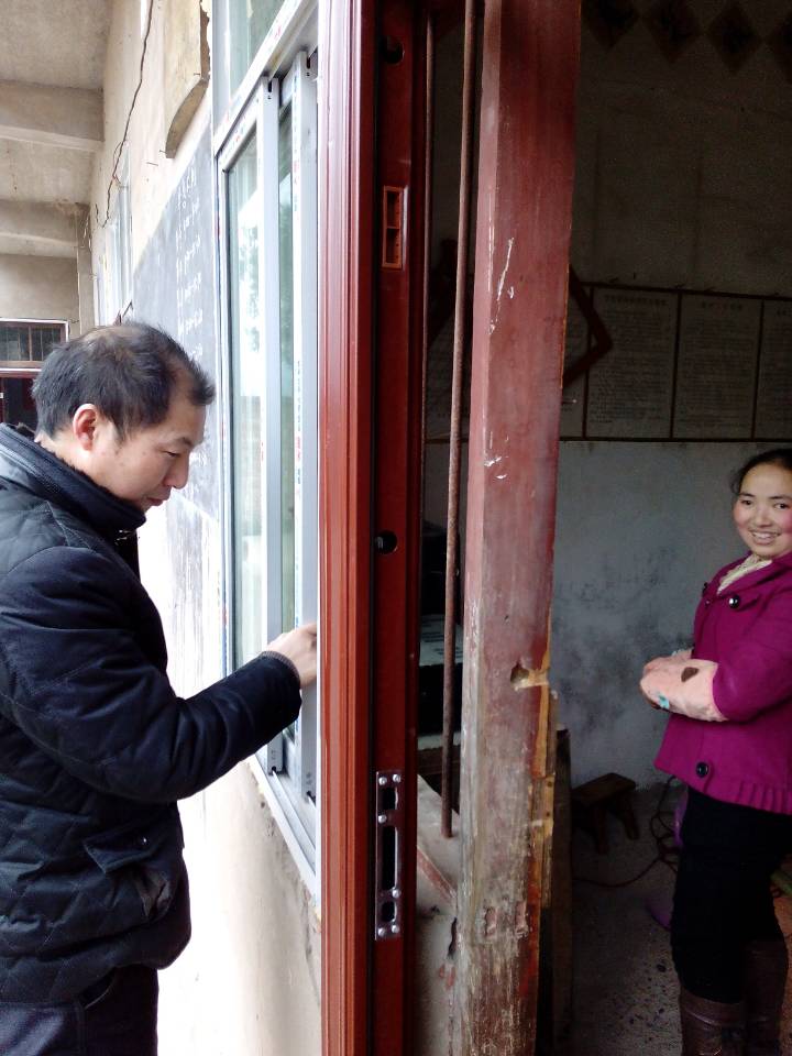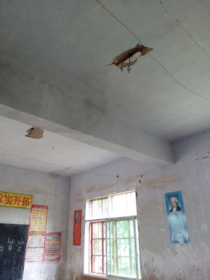 再看了复式班的教室,靠近教室门口玻璃窗上的玻璃早已不见了,老师说便于早来的孩子伸手进去就可以打开门闩进教室放书包。教室的墙上有爱因斯坦、牛顿等名人的画像。无意中抬头,却看见屋顶天花板上有几处醒目的脱落的痕迹,我们对此很是担心,老师说没事的,有好几年了,可能是零八年大地震留下的伤痕吧。在摆谈中,付老师说她在在这里工作十五年多了,为了家中老父老母和两个正在读书的孩子,丈夫只得长年外出打工,她每月工资平均下来将近一千元,幸运的是可以照顾家里,蔬菜、粮食还有农副产品一年下来也可以自给自足了,她现在最大的愿望是能转正,再苦再累也无憾了。
