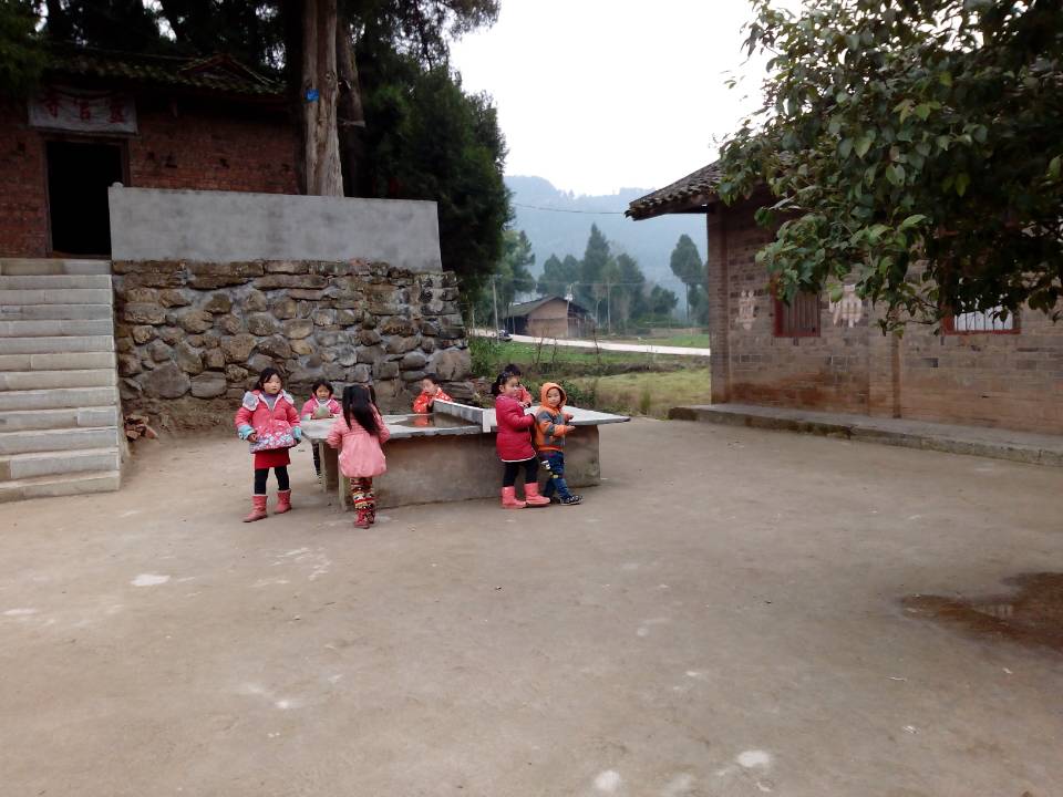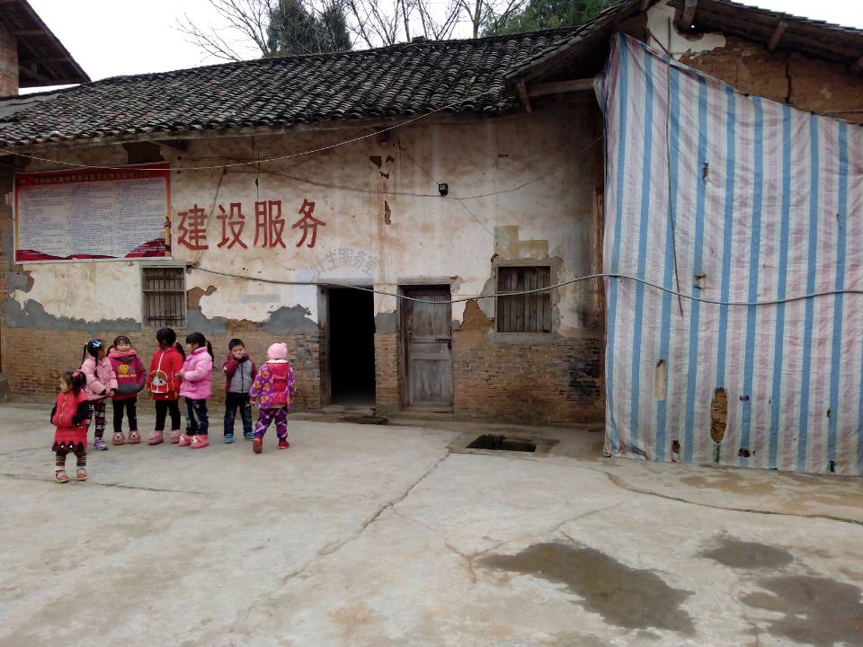 期末时间很紧,第二天上午,我们早早驱车赶到离中心场镇更远的双柏垭村。离校门口最近的一排房子应该是民房的后墙吧,一举两得做了学校的内墙,满是裂缝的土墙被一张千疮百孔的条纹油布紧紧蒙着,让人想到一个半老徐娘在脸上涂脂抹粉来掩盖韶华已逝的容颜!墙脚早已脱落,露出层次分明的砖头,就像腐尸的根根肋骨。有一间屋子门前隐约可见“计生服务站”几个字,我们才得知这是学校与村委会共同办事的地方。上面的墙壁上还留下 “建设服务”的几个油漆大字,我们推断应该是当年提倡的“教育要为社会主义建设服务”吧。几个身子裹得棉球一般的孩子正在做什么游戏,有的见生人来了,连忙惊慌逃窜到教室里去了。