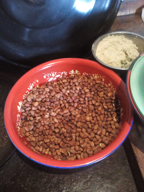 首先,煮大豆,将捡好的大豆 放在装好的锅里面煮,等到大豆被煮软一些时,便捞出锅,然后用几件旧的棉衣包裹起来,再放上一夜,第二天早上,将棉衣拿掉,就可以炒了。