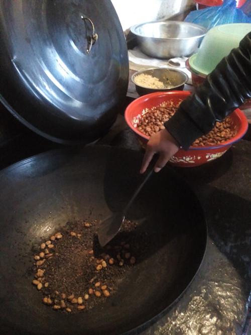 炒大豆时,是最麻烦的。首先,要在灶台上生火,然后,在大锅里放一些石头和盐,并把它们加热,炒大豆时,不能全放,要一点一点的放,火候不能太大,手上的动作也得快,不然大豆炒焦了,可就不好吃了,炒完之后,先把大豆放在灶台上晾一晾,然后装进碗里去,这样就算炒完了。最后,不要忘了把石头和盐倒出来,把锅刷干净。