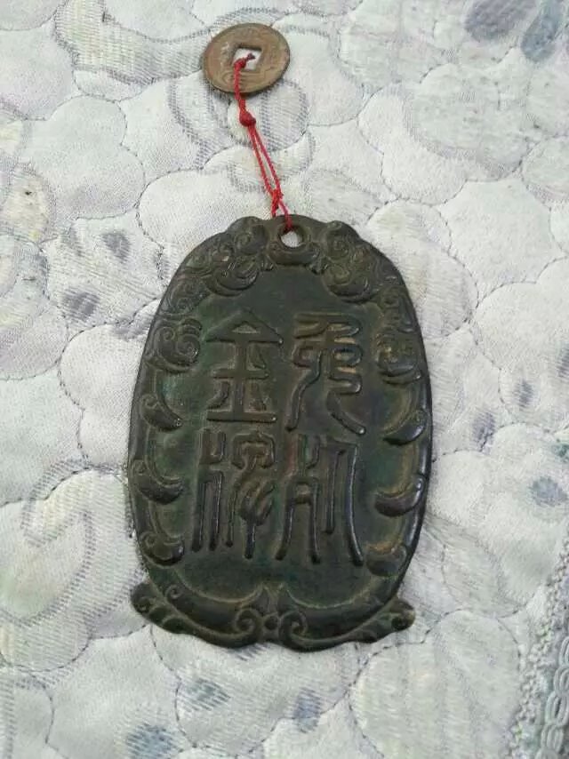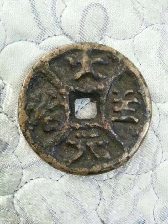 这个钱币是我姑爷爷年轻的时候去工地打工的时候,用铁锹挖出来的,当时已经被黄沙和水泥掩盖了它本来的面貌,姑爷爷只能用钱币的洗液一遍遍的跑洗,终于功夫不负有心人,钱币上的字也看清楚了,周边的花纹也愈显愈亮,姑爷爷喜欢的要命,就用红绳将他串起来了,增添了许多。
