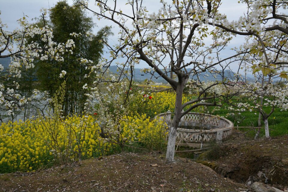 我们到了云峰后,变闻到一股芬芳,一闻变神清气爽,来时所有的苦,都抛到九霄云外了,,那儿到处都是梨花,白的像雪,还有桃花红的像火,它们竞相开放,为人民展示自己的风采。