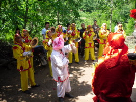 有些老奶奶和老爷爷打扮得漂漂亮亮的在扭秧歌,我也笑眯眯的跑到跟前,跟着学起来,我跳的累坏了,我跑进去,去找我小姨,看见小姨是那样美丽,那样幸福!