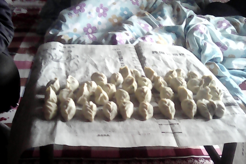 现在好了,我和父亲开始干杂活了,开火,拾柴,加炭……大约40分钟以后,饺子馅好了,开始包饺子了,馅皮很韧,为了防止饺子在下锅的时候就露馅,姑姑擀面皮的速度一点儿也不落后,她一人擀,我和父亲也赶不上她的节奏,最后也只能出现一种情况,面皮太多,又被粘在一起了,只好又和在一起,继续往开擀,我和父亲的速度也让姑姑无语。