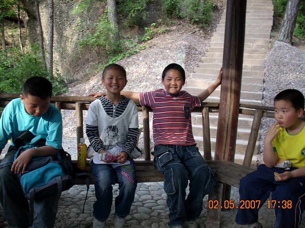 从关楼走险道,就到了后关门。后关门是一个幽深的峡谷,小溪上有座小桥,一个亭子。我们坐在亭子上歇了一会儿。这时候,南京的小朋友就教我们四川的小朋友说英语,大家真快乐。
