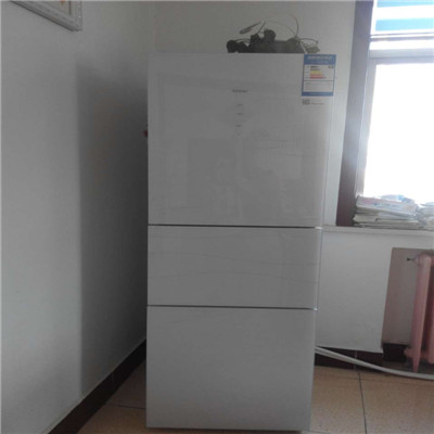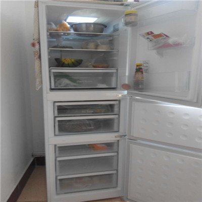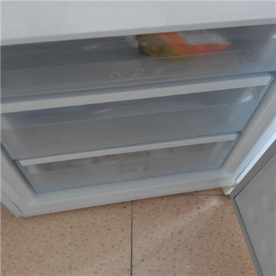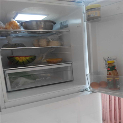 它的上面是冷藏室,空间很大。中间是零度保鲜室,小小的,最下面的一个是冷冻储藏室,能储藏很多东西。冷藏室可以放一些水果、鸡蛋。零度保鲜室可以放一些绿色蔬菜,即使放了3、4天等你拿出来后,它还是绿油油的,特别好吃。