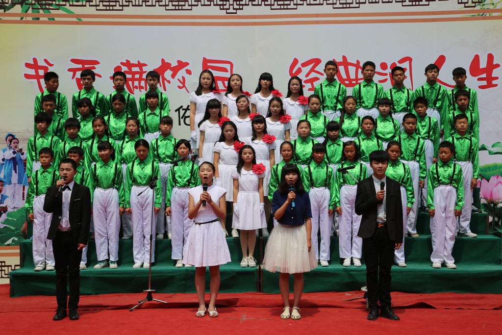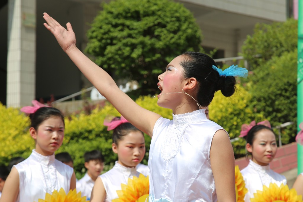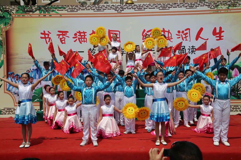 一面小小的红旗,一个时时刻刻向着太阳的向日葵,其实并不绚丽的服饰,在普通的舞台上演绎着神一样的表演。这是一场神圣的表演,也是一场惊心动魄的表演,更是一场崇高的节目。爱国行动在我们身边上演,在我们身上实行,在书中埋藏,在经典朗诵中升华。祖国万岁!