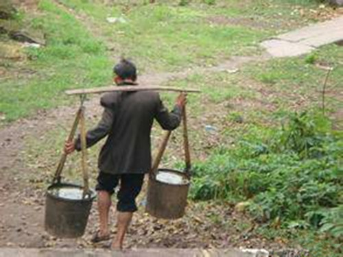 我走到粪塘边儿上,提起大粪舀,在前面的一桶倒入两舀,后面还特意少倒了一些,以防出现像上次那样的意外。我小心翼翼地把粪桶担起来,摇摇晃晃地向前走了几步,肩膀被扁担压得生疼。就这样,我忍着疼一走一晃,难受地走到了菜园里。第二趟时,肩膀就已疼得不行了。不得不在路上休息一下才又重新把大粪担起来。