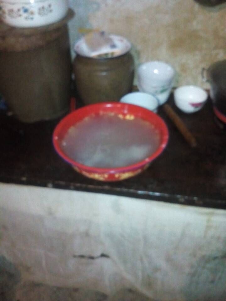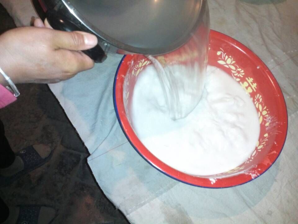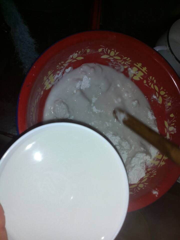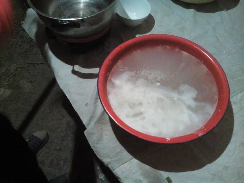 做洋芋粉的过程很简单,首先,取两碗粉面,倒入脸盆,再加入适量的水,搅匀,然后,烧一锅开水,搅的时候不能停,否则又会沉下去,在烧好的开水中放一些白矾,让其融解后,把开水倒入搅匀的粉面中,停止搅拌,当他凝固的时候,洋芋粉就好了。