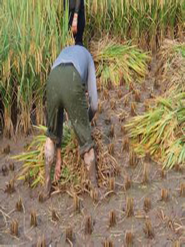爸爸和叔叔们忙着收割。他们弯着腰,左手抓住谷杆,有节奏的挥舞着镰刀,不一会儿,就割倒了一大片。镰刀发出"咔嚓、咔嚓"的声音,仿佛是一支优美的收割曲。一大群鸟儿唧唧喳喳的叫着。