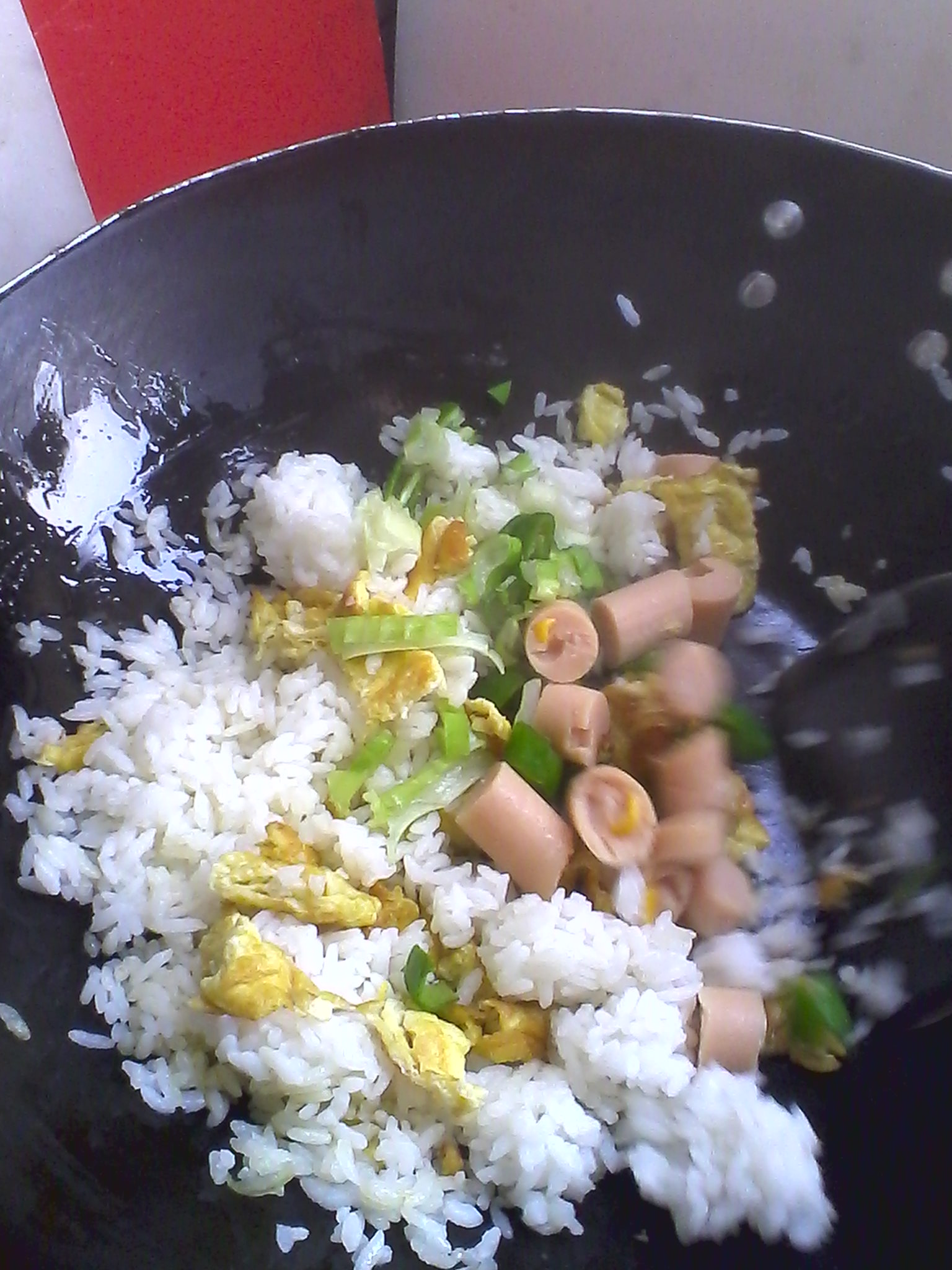 我在妈妈的指导下,小心翼翼的打开电磁炉,把锅暖了一小会,感觉有热气出来时我倒上了一小勺的油,妈妈告诉我说油熟到七八分时,就让我往锅里倒入已经打好的鸡蛋,翻炒一分钟,有点鸡蛋的香气出来时,倒入剩米饭,撒上一点盐和鸡精,继续用勺子翻炒,待饭粒呈金黄色时,我又撒上事先准备好的辣椒和火腿肠,炒了两下,就可以起锅,这样我亲手做的香喷喷的蛋炒饭就成功喽!