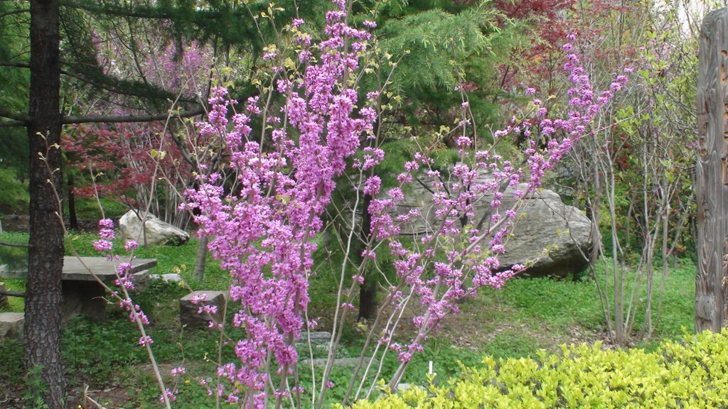 青山绿水环绕,百花齐放,鸟语花香。碧波荡漾,鱼儿在水中嬉戏,水中央有一颗柳树,纤细的柳枝荡漾在水上,犹如人间仙境。