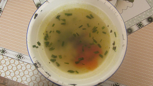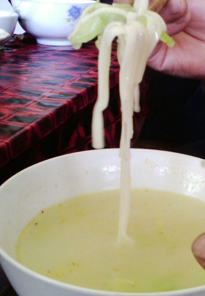 浆水的制作却是非常简单,首先,和别人要一些发酵好的浆水,买一些芹菜,莲花菜,以及洋芋,清洗之后切得稍微碎一些,然后,在大锅里烧一大锅开水,在这期间,要找个小点的缸,清洗干净,里面放两根筷子,等到水开时,将菜全部倒入,开始煮,煮熟之后,将水和菜全部倒入缸里,把事先准备好的发酵的浆水倒入一些,然后,把浆水抱到炕上,用擀杖搅拌,再将剩余的浆水全部倒入,然后又进行搅拌。
