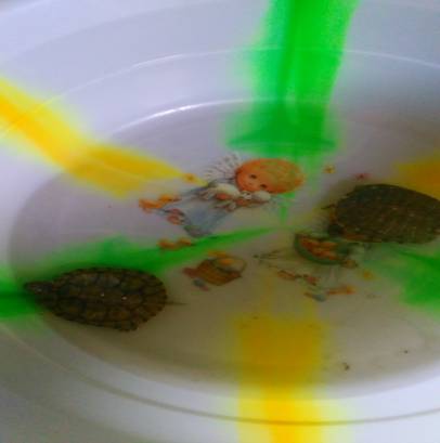 虽然我没有了小鸡,但我还有两只小龟龟,我不能灰心。我的小巴西龟还得要我照顾呢?他们是一对,是同伴。小龟龟们长着一副坚硬的贝壳,上面长着十三个菱形块,好像背着勇士的铠甲。每天看着他们进食,然后在盆子里不停的爬呀爬,日子也很惬意。我给他们找了一块干净的晒背石放在水里,共他们困了的时候爬上来休息,每天还给他们喂新鲜的肉或者虾。但不能喂得太多,吃多了,龟龟会消化不良,会生病的。