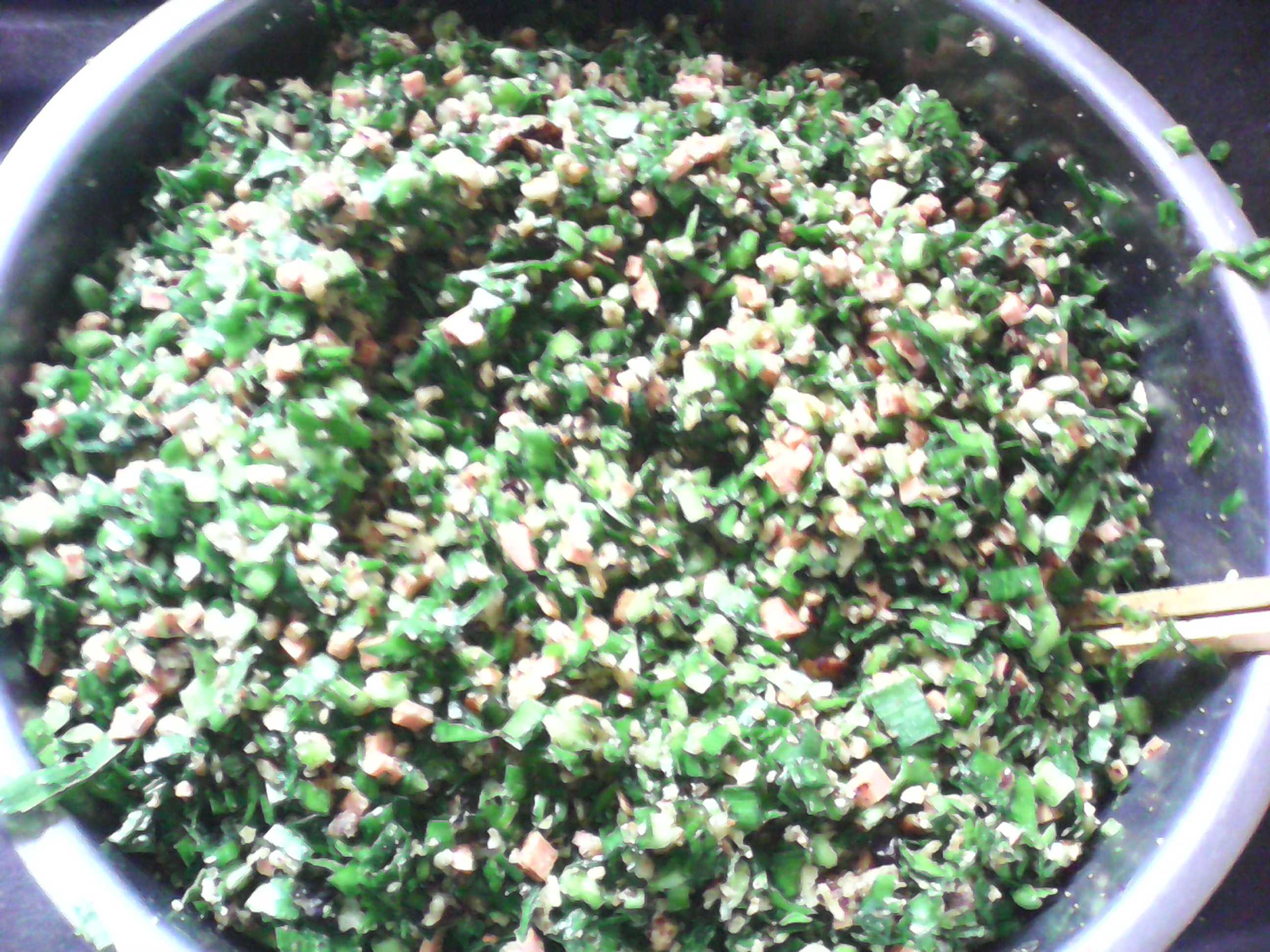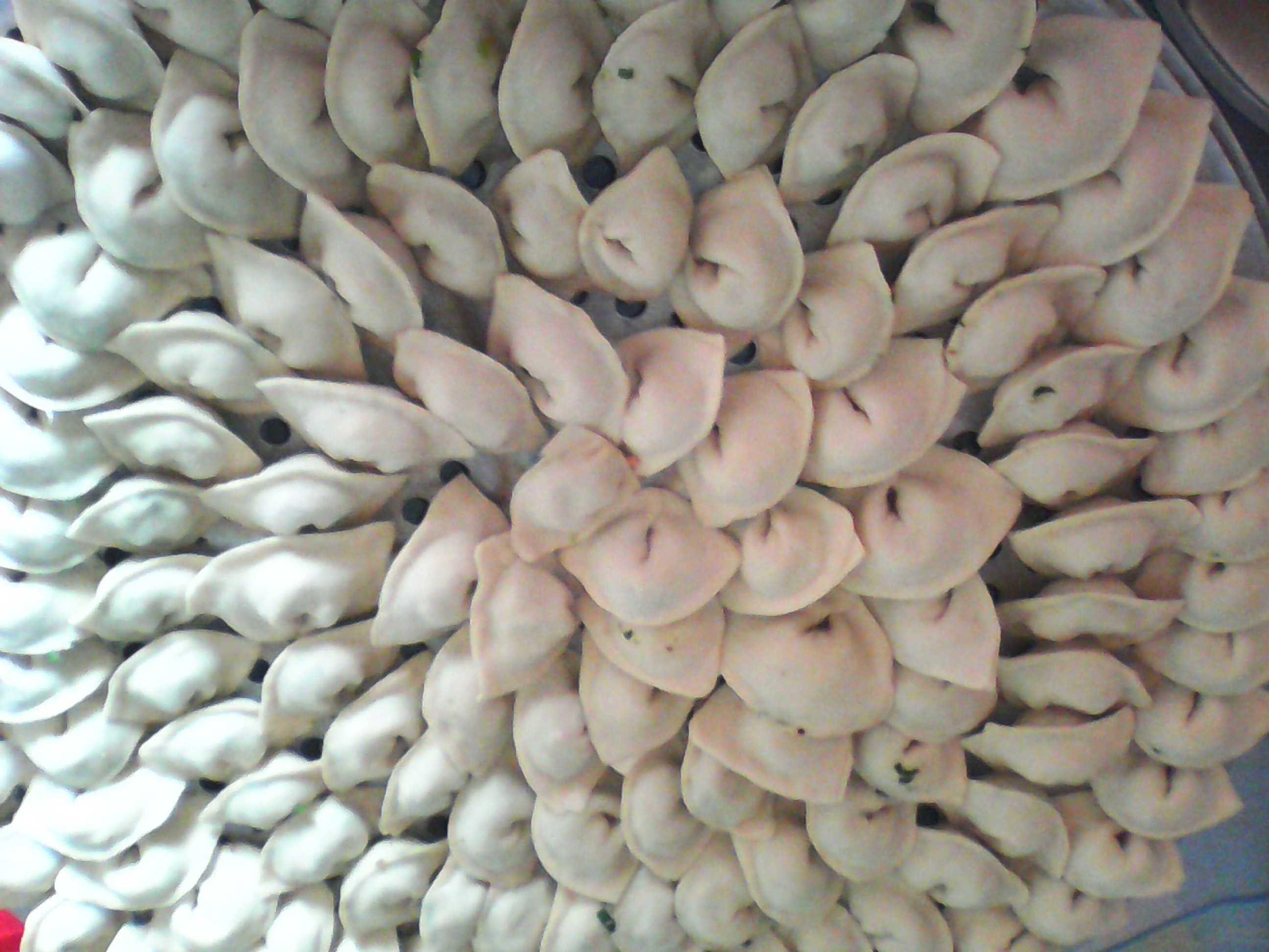 家乡的饺子口味之所以惹人喜爱,是与它的制作分不开的。首先,在选料上面,要用上乘的面粉作为主料,和好面,用擀面杖将面擀薄切成正方形的面片,也可以用形具(一种圆形的圈)做成圆形的面皮,通常是用一些凹槽较深的大一点的瓶盖去替代,不过这取决于饺子的形状,盖子压圆形作起面皮来相对慢一些。对我来说正方形的面皮又快又省事,也是最传统的做法。接下来就是包饺子的压轴环节——拌馅。有的人爱吃素的有的人爱吃肉饺子,这饺子香不香就在这馅味上,放上各种作料,滴上食用油,就做好了馅。馅做得好,饺子皮擀的好,饺子自然吃起来就香。这些都保障之后就是包了。首先将擀好的面皮放在手心中,往皮上放上适量的馅,然后两边相叠,要用劲压使饺子皮粘到一起,这样馅才不会漏出来,压好后两角相对按一下就包好了。这样一个个活灵活现的饺子就包好了。