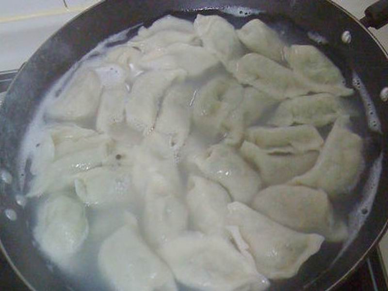 将包好的饺子连盘端起轻轻地抖动到已沸腾的开水锅里,用马勺抠住锅底搅动几下,以免饺子粘到锅底。中火烧开点两三次的凉水后,就可以捞出来享用了。伴上肉臊子汤或者是浇上蒜汤水,味道真是鲜美极了!
