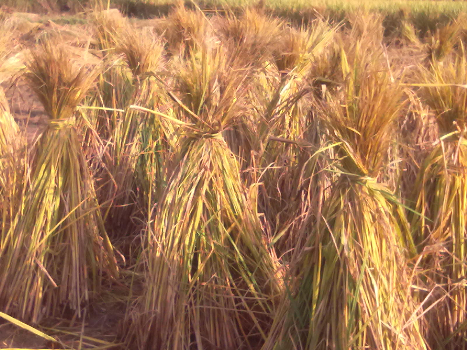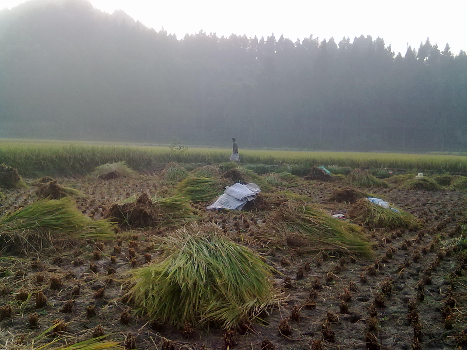 当我们把田中的稻谷一把一把地打完时,我们又会把那些打过后的稻草像那样一大把一大把地捆起来,竖立在田中,以便日后烧材用了。忙完了一早上的我们此时也很疲惫,只想赶紧回家吃上一口热饭。
