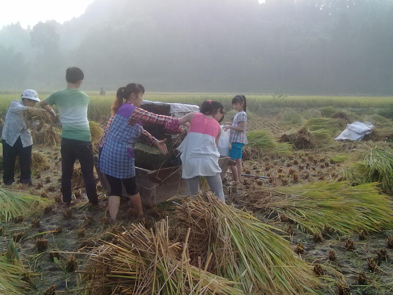 田里散发着稻香,昨天黄昏割下的稻谷现在正湿润着。我们放下手中的农具,从人家那里借来了机器,抬入田里。打谷机被放置在了一个方形的桶上,用绳子固定好。我们准备好带来的口袋用来装稻谷,一切准备好了。