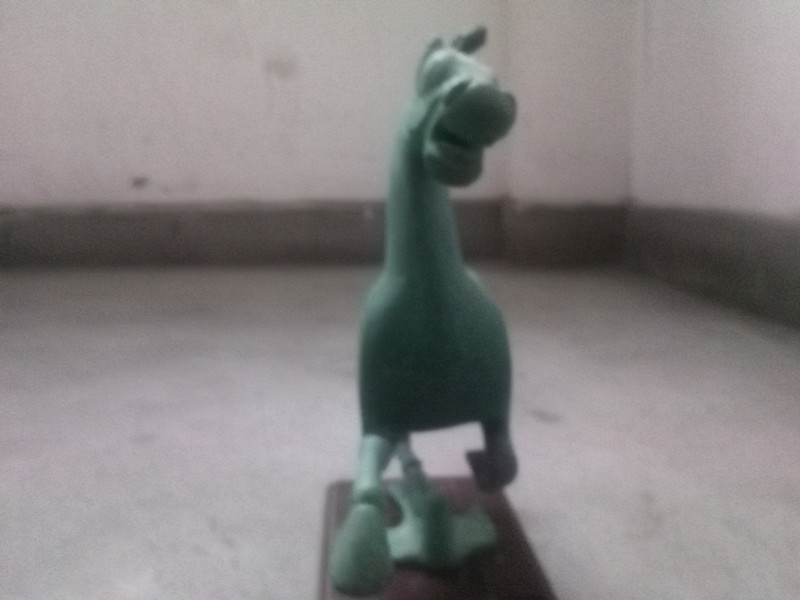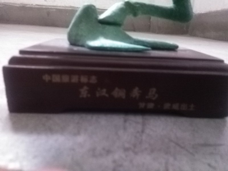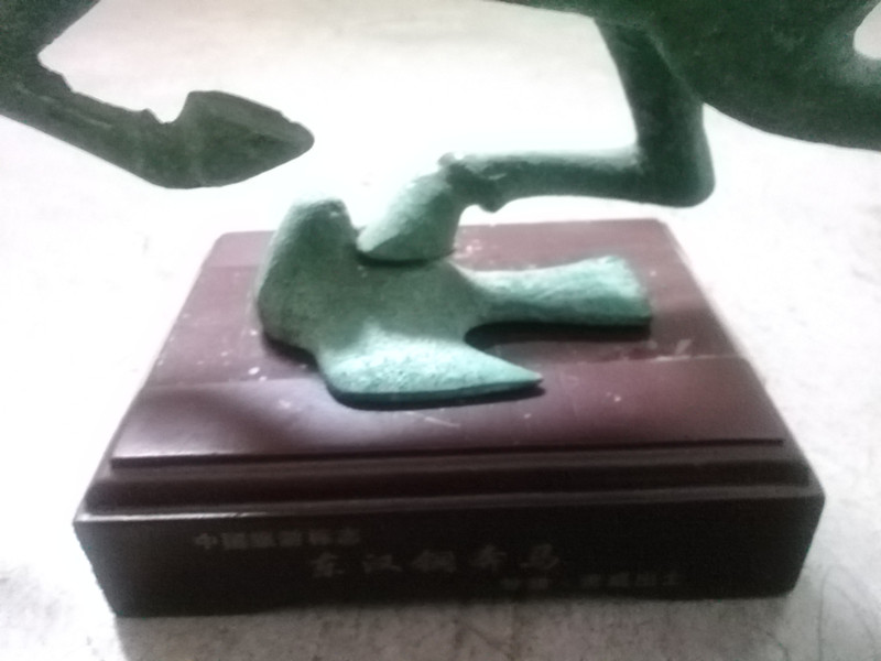 爸爸的朋友给他送了一件工艺品——铜奔马。据说铜奔马出土于武威地区,是东汉时期的青铜陪葬品。这件铜奔马整体上为一匹腾空而起的骏马足踩一只飞翔的燕子,气势磅礴,暗示着死者生前飞黄腾达,铜奔马座底有四个篆书大字"马踏飞燕"。