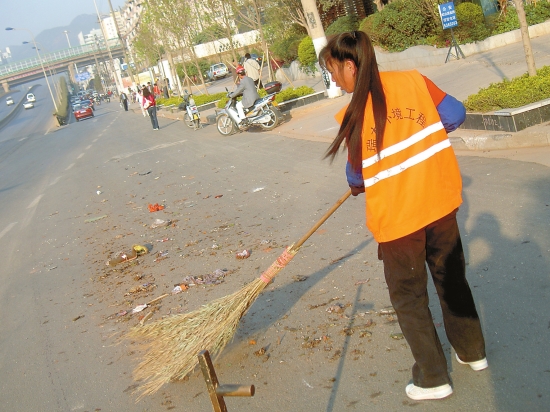 但是,这个社会却是如此的现实,有修养的人们不忍破坏城市的整洁;缺乏道德素质,外表光鲜的人却有太多太多。他们磕着瓜子刻,毫无形象的行走在大街,他们的身后留下一长串的瓜子壳,如同白洁嘴的脸上长出的一排痘痘,格外显眼。这些清洁工人们,就默默地跟在身后,把瓜子壳一点一点的扫入桶中。他们走到这些人面前:“刚才的瓜子壳我已经扫干净了,别再乱扔了。”然后呢?这些毫无修养的家伙却给他们这样一句话:“我不扔,你们拿什么扫?”然后我行我素的继续仍瓜子壳。每次看到这一幕,我都特别的气愤,为何这世间有高低贵贱的等级之分?难道劳动人民真的应该受到嘲讽和不公平的待遇?