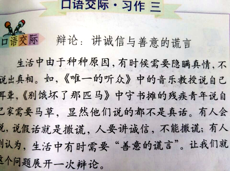 这一单元的口语交际是进行一次辩论赛,在五年级时我们已经初步了解了辩论赛,所以这一单元老师让我们自己组织这次辩论赛,并给了我们一周的时间准备。辩论赛的主题是“讲诚信与善意的谎言”。
