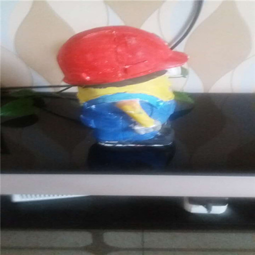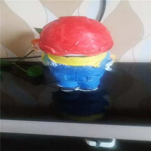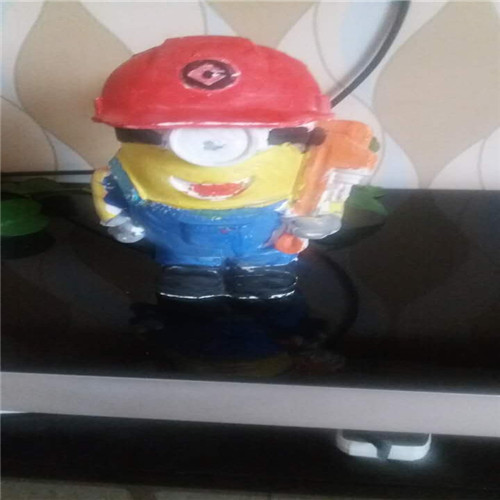 小黄人长得矮矮的胖胖的,我把它圆圆的眼睛涂成了黑色,就像一个圆圆的黑宝石一样看起来特别有神。我把它的小嘴巴涂成红色的就像樱桃一样,真想咬一口。我给它穿上了蓝色连体衣,黑色的皮鞋。它的手里拿着工具带着红帽子,就像一名为人民服务的工人一样,特别可爱。