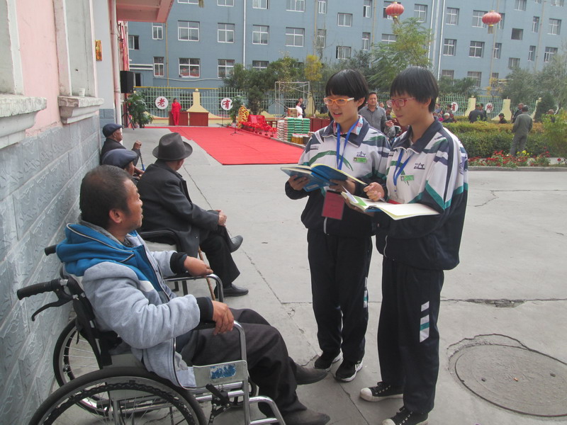 时间:2015年10月21日(9、9重阳节)下午2点。地点:红古区敬老院。举办单位:十七中学。活动主题:发扬中华民族敬老爱老的传统美德,为老人们献爱心、致慰问、送祝福。采访对象:校长、老人代表等。采访人:刘璐、达芊如、王姝琦等 今天下午两点整,我们在校长及老师的带领下,带着为老人们准备的各种慰问品,并怀着对老人无比敬爱的心情一起来到了红古区敬老院。刚来到院外就远远地看见院领导及部分老人代表早已迎候在门口,我们的内心更是无比的激动,多么善良的老人啊!校长早已快步来到老人跟前紧握老人的颤抖手嘘寒问暖致以节日的祝福!我们几个同学也来到老人们面前深深鞠躬"祝爷爷奶奶节日快乐、健康长寿!"