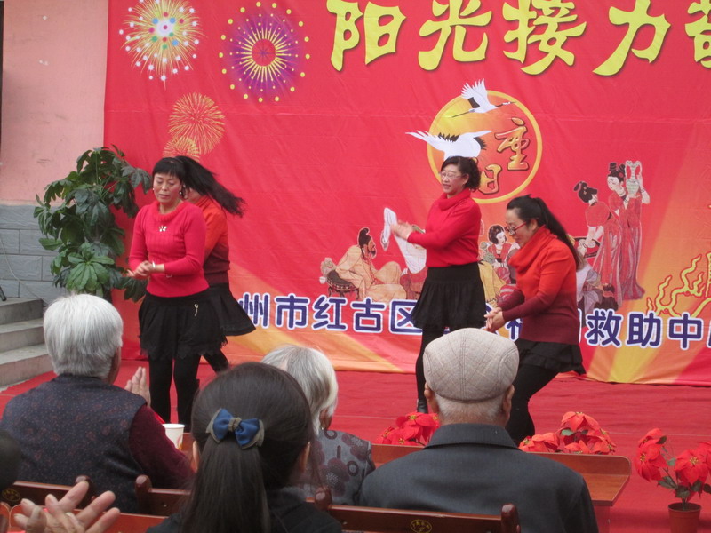 随后我们为老人们表演了文艺节目,也为老人们敬献了礼物,整个现场充满了节日的喜庆,同时也充满了亲情友情!我们采访小组开始了采访。 小记者;"校长,您好!通过这次活动让老人们过了一个愉快的节日,您认为老人们最需要的是什么?" 校长:"老吾老以及人之老,幼吾幼以及人之幼,尊重老人是中华民族传统美德,我们应该呼吁全社会都来孝敬老人,关心老人,特别是同学们这一代人!我们学校将举办更多的活动以给老人们更多的欢乐!"