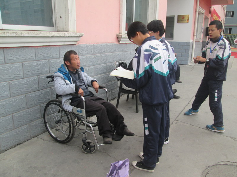"爷爷,您平常都做些什么?" "平常就与老伙伴们聊聊天,下下棋,也帮助管理员打扫打扫卫生!" "爷爷,想再请教一个问题,您对当今社会"啃老族"有什么看法?"面对这个问题爷爷沉默了一会说:"如今一部分年轻人不思进取、好高骛远,小事不想做大事做不了,全靠父母养,殊不知有一天父母年迈怎么办,真心的希望他们能自立自强!""好的,谢谢爷爷!"此时此刻我似乎明白了什么,明白自己应该刻苦努力的学习,做一个有用的人! 我们的采访很快就结束了,但是我的心情却久久不能平静,不由的想起自己的爷爷奶奶,想起自己平常的任性和无礼,平常对爷爷奶奶的不尊重,巴不得一步来到爷爷奶奶面前说:爷爷奶奶,对不起!请您们原谅我的无知!以后我一定百倍的关心和敬爱您们!