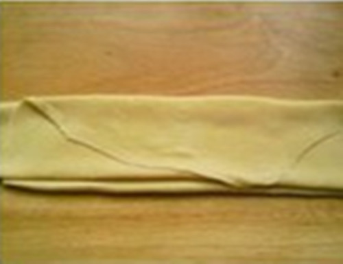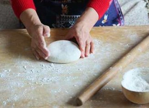 第二步,擀面皮。将案板(也可用大方桌)擦拭干净,晾干水分。然后把面团放在案板上(如果面团太大,也可切小了擀),用擀面杖将面团往不同的方向擀,使其变薄。如果面团黏案板或擀面杖可以向桌面或面团上撒干面粉用手抹匀再擀,那样就不会黏住了。面团儿一定要擀薄这样煮出来的面皮才好吃。