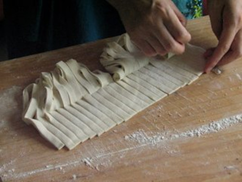 第三步,切面条。面团擀好了往上边撒些干面粉抹匀,将擀好的面皮朝一个方向对折几次,折成约四寸宽的条。再用菜刀横着切成小条,宽窄视各人的喜好而定,喜欢吃宽面就切宽一些,喜欢吃细面就稍微切窄一点儿。最后,把切好的面条抖散,铺在案板上。