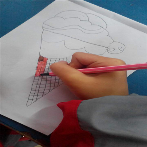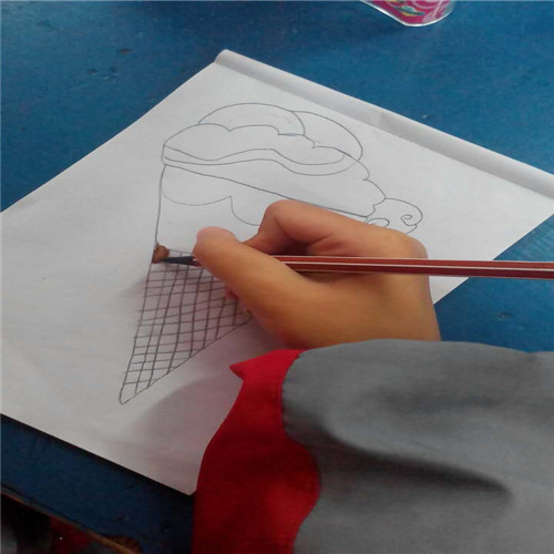 我先用铅笔轻轻地把冰淇淋的形状先画出来:先画一个斜的三角形,然后再在三角形上面画连起来的半圆形,再在半圆形上面画两个半圆形,然后就装饰。用铅笔画好了再用彩笔描出来:用褐色把三角形描出来,然后用自己喜欢的颜色描出半圆形,比如我喜欢粉色,就用粉色描出来。"画好了!"但是我总感觉还缺什么东西。我想了半天才想出来:原来是装饰品。我加上了装饰品,这样看起来就好多了。