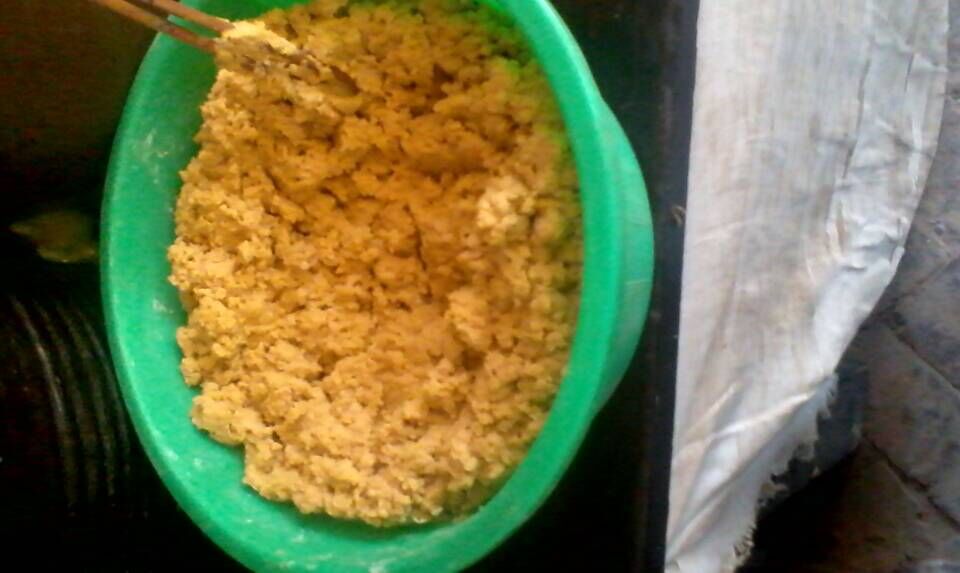 首先,在面盆中取半盆苞谷面,然后倒入沸腾的开水烫,并且搅拌均匀,再接着,就是在搅拌后的苞谷面中和入酵面——发酵后的面团,和适量的面,待搅拌均匀后在苞谷面上覆盖一层白面,用盆子盖住,然后就让它自己发酵。