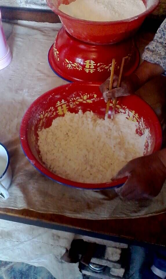 等过五六个小时后,再把发酵后的面搅拌均匀,适量的放入一些苦豆——一种绿色的粉末状的豆子。再放入一些白砂糖,搅拌均匀后就可以盛到碗里了,接着,就可以蒸了,在蒸盘上放入适量的碗,盖上锅盖,再用衣服或其他东西将锅盖覆盖,蒸上大概40分钟后就熟了在刚取下时,先不要吃,等到晾冰的时候,倒扣过来,形成一个碗状,这样苞谷面馍馍就做好了。