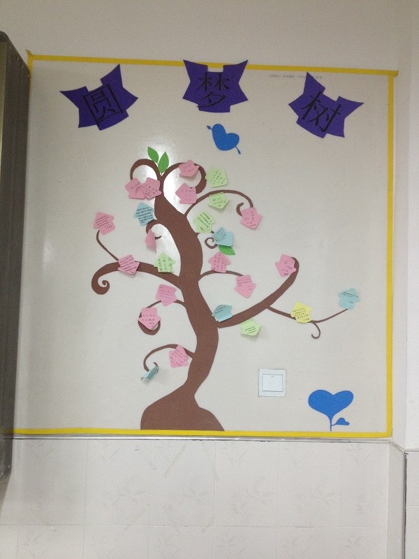 黑板的两边分别是“班务栏”和“圆梦树”,特别是“圆梦树”,是每个同学对未来的美好期盼,他承载着我们的梦想。